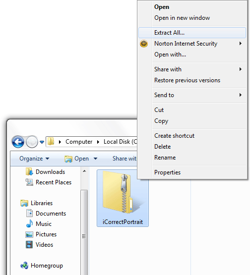 1. If the iCorrect OneClick, EditLab, and Portrait files are in a compressed folder (as they will be if you have downloaded the product), extract the files by right-clicking the compressed folder (a zip archive) and then clicking Extract All. This will uncompress (unzip) the folder that contains the plug-in files.