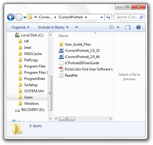 2. Look at the files contained in the iCorrect Plug-in folder. The ReadMe file contains a condensed version of these installation instructions. The software license agreement is provided in a PDF file. The User Guide may be viewed by opening the file named iCPortrait20UserGuide with a web browser. One or both of the plug-in files iCorrectPortrait_2.0_32 and iCorrectPortrait_2.0_64 must be copied into the host application's Plug-Ins/Filters folder, as described in steps 3 and 4. Note: CS6 does not have a Filters folder so copy the plug-in file into the Plug-ins folder.