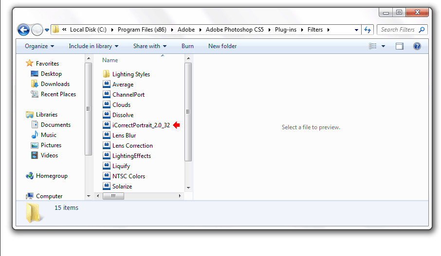 3. To install for use in a 32-bit application (Photoshop CS3 and earlier, Photoshop Elements, etc.), copy the file named iCorrectPortrait_2.0_32 to the Plug-Ins/Filters sub folder of the host application folder. If you are installing in the 32-bit version of Photoshop CS4 or CS5, the application folder is usually located at C:\Program Files (x86)\Adobe\Photoshop CSx\. Note: CS6 does not have a Filters subfolder so install the plug-in file in the Plug-ins folder.