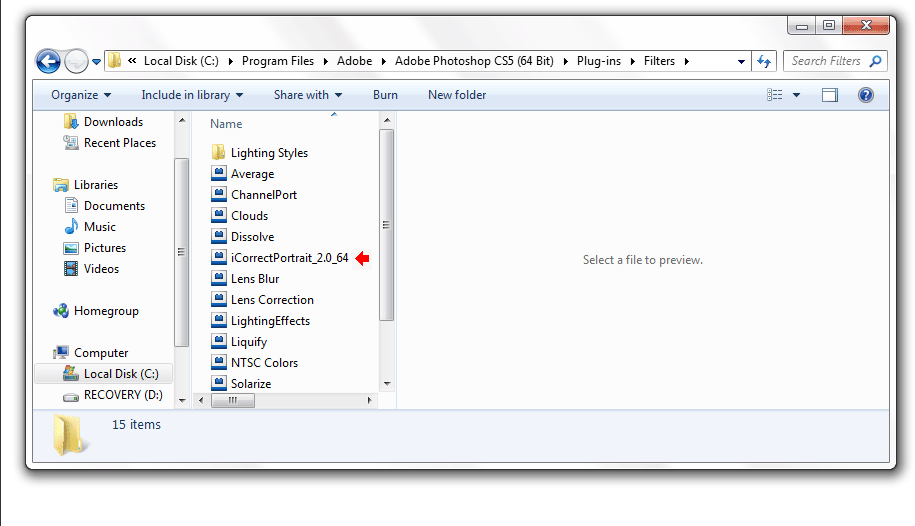 4. To install for use in a 64-bit application (Photoshop CS4 and later), copy the file named iCorrectPortrait_2.0_64 to the Plug-Ins/Filters sub folder of the host application folder, which is usually located at C:\Program Files\Adobe\Photoshop CSx\. Note: CS6 does not have a Filters folder so install the plug-in in the Plug-ins folder.